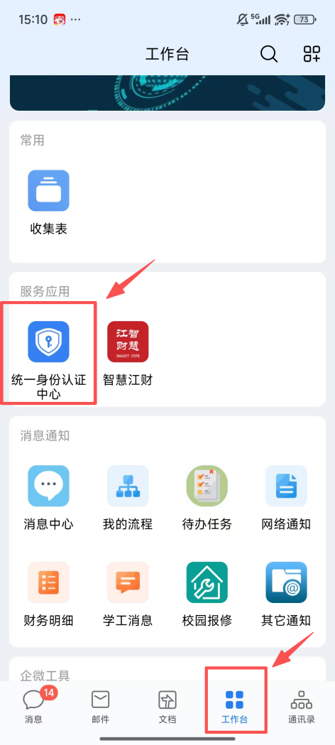 b)进入江西财经大学企业微信→工作台→统一身份认证中心