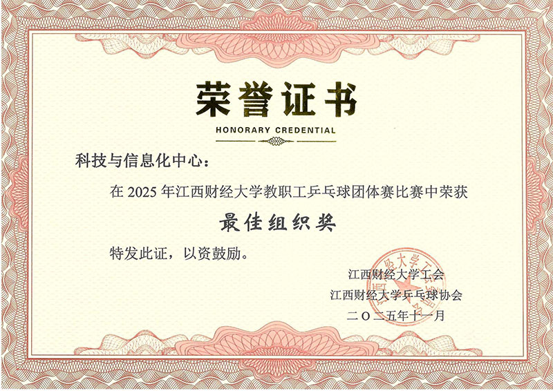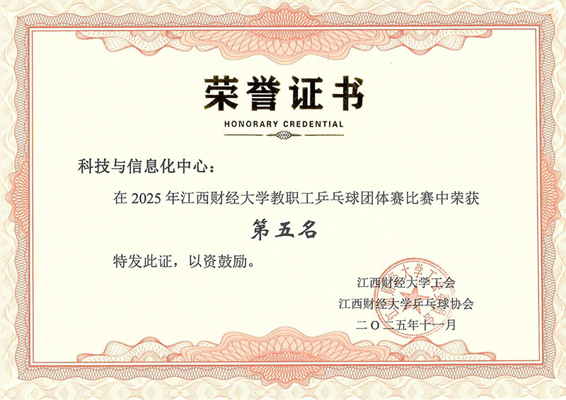 近日,校工会组织开展了“2025年江西财经大学教职工乒乓球团体赛”,中心分工会积极组织,精心选派教职工参赛。经过激烈角逐,中心代表队在全校十一支参赛队伍中脱颖而出,最终斩获团体第五名的优异成绩,同时,凭借赛事组织期间的出色表现,中心还荣获了“最佳组织奖”。